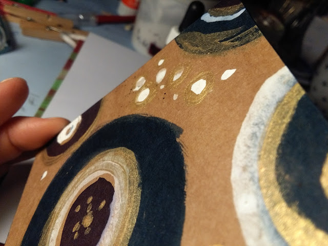 Der quadratische aus Kraftpapier auf Wellpappe mit Tuschen und Acrylgold.